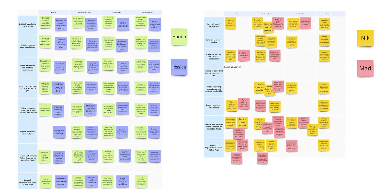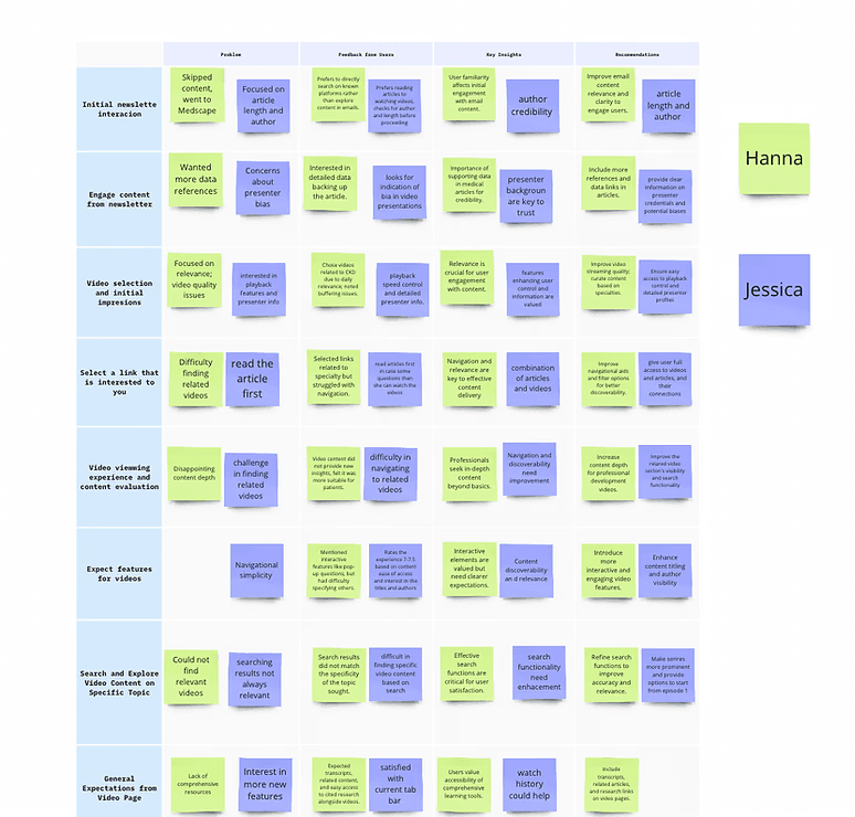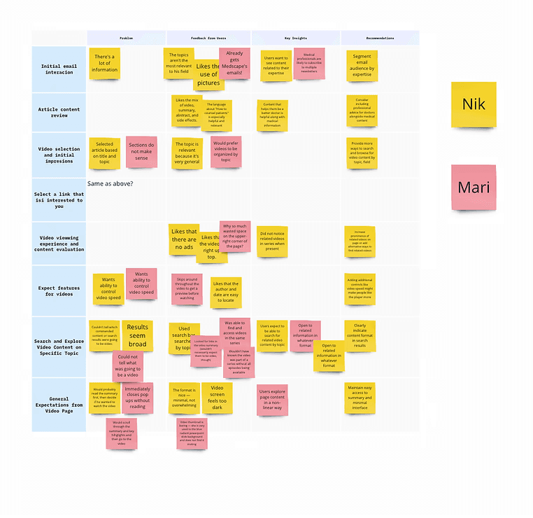 In the analysis phase of the usability study, we utilized affinity mapping to synthesize and interpret the data collected from the user testing sessions. This method was critical for organizing large volumes of qualitative data into coherent, themed clusters that reveal underlying patterns and insights about user interactions with Medscape’s video platform.