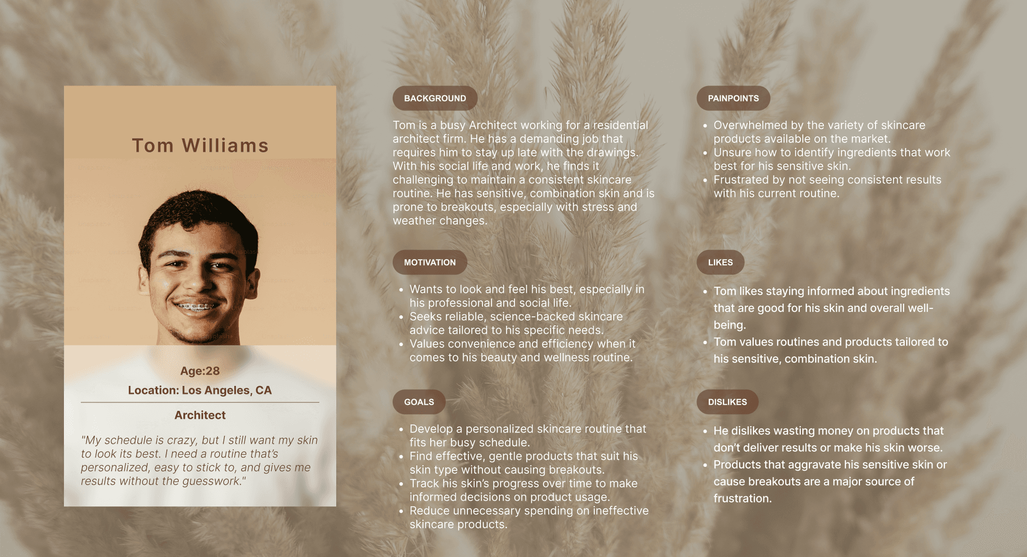 “As a skincare and health-conscious person, I need a solution that links my skincare with factors like diet and stress so that I can better understand and manage what triggers my skin issues and make informed decisions to achieve visible improvements in my skin health.”