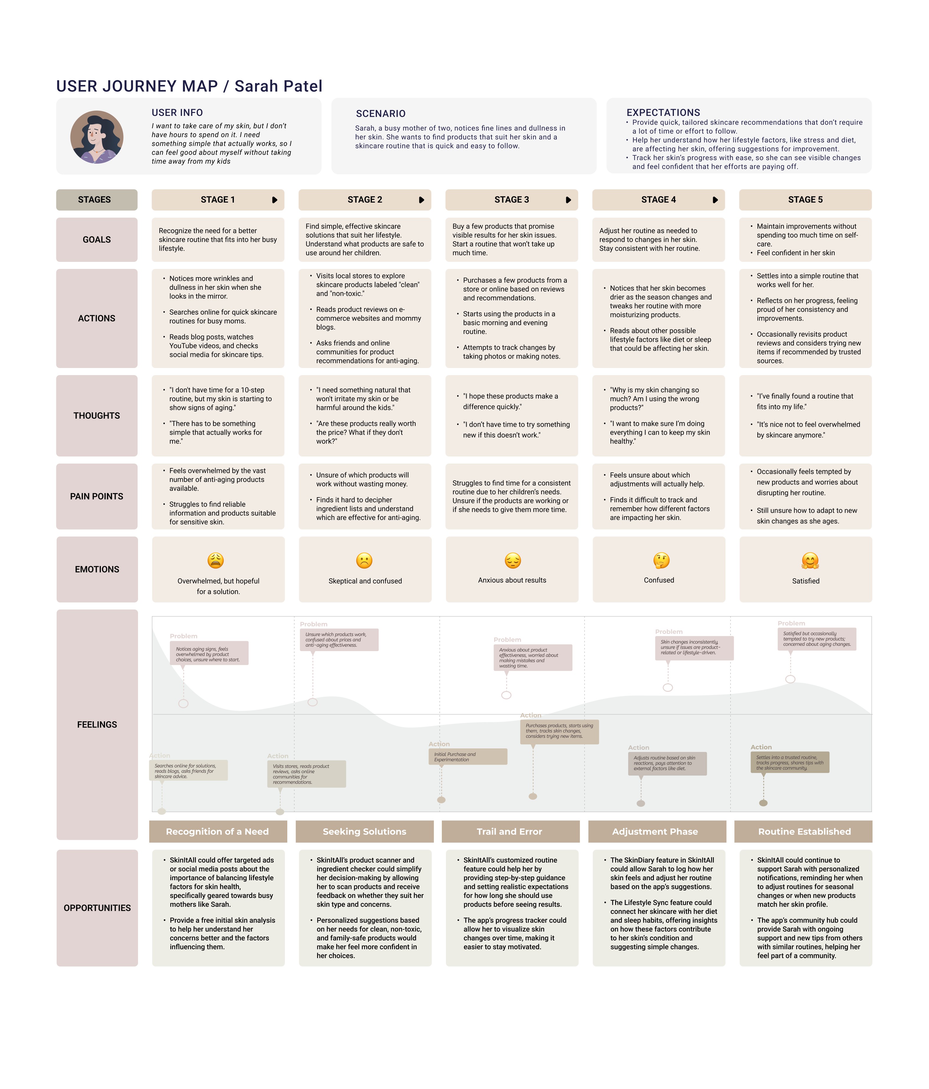 We built a user journey map to track the stages from recognizing a skincare need to establishing a routine.