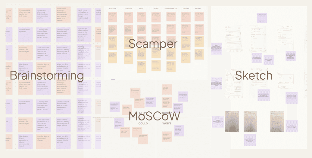 To synthesize our findings, we created an affinity map, grouping common themes and patterns. This helped us identify recurring concerns, motivations, and behaviors, providing a clear understanding of user needs. The insights gathered from this process informed our approach to designing a more personalized and effective skincare solution.