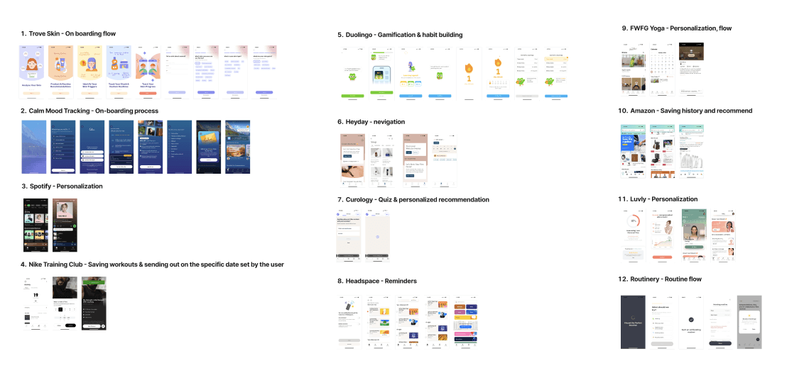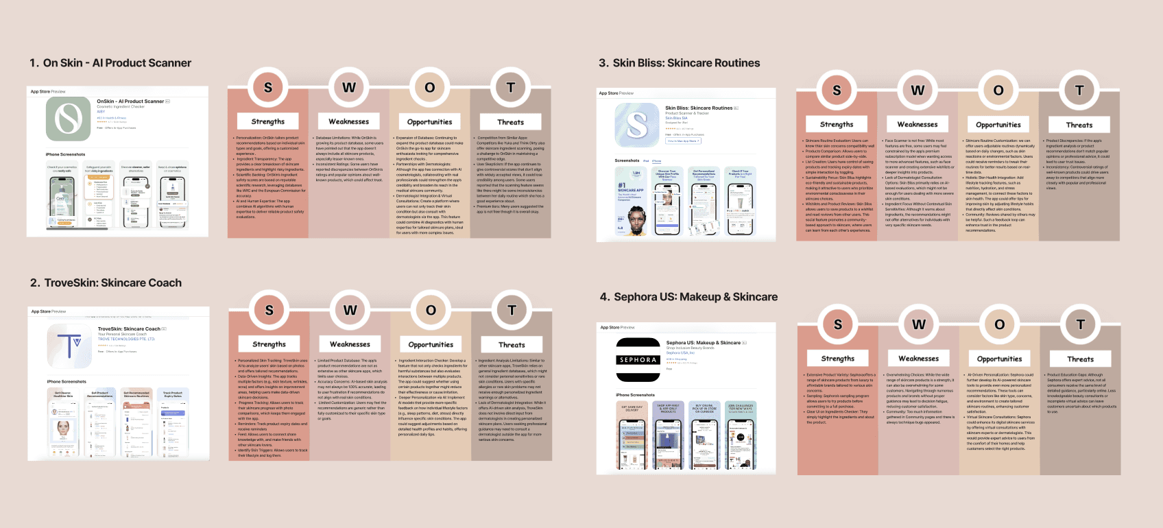 We conducted a competitive analysis of 4 skincare apps using the SWOT method to assess strengths, weaknesses, opportunities, and threats. Additionally, we performed lightning demos of 12 products to gather design inspiration and identify innovative features for an improved user experience.