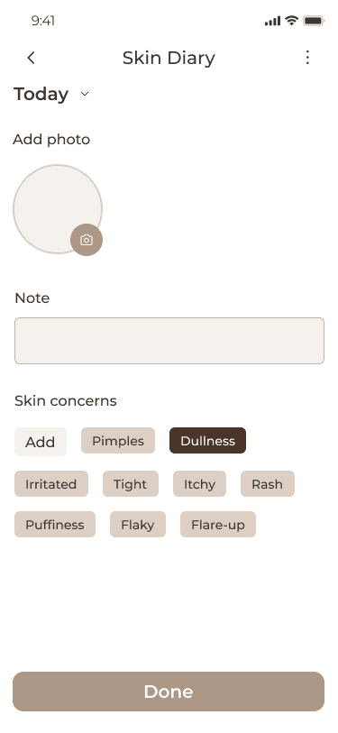 Allow users to log how their skin feels post-product use, record irritations, and monitor how lifestyle factors impact their skin.