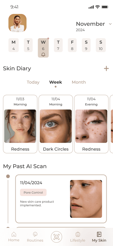 To help users document their skin’s progress and identify triggers over time and capture your skincare journey and discover patterns by logging daily progress and lifestyle influences