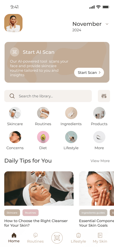 AI-driven app that provides personalized skincare by syncing routines with lifestyle factors like sleep and stress for holistic skin health management